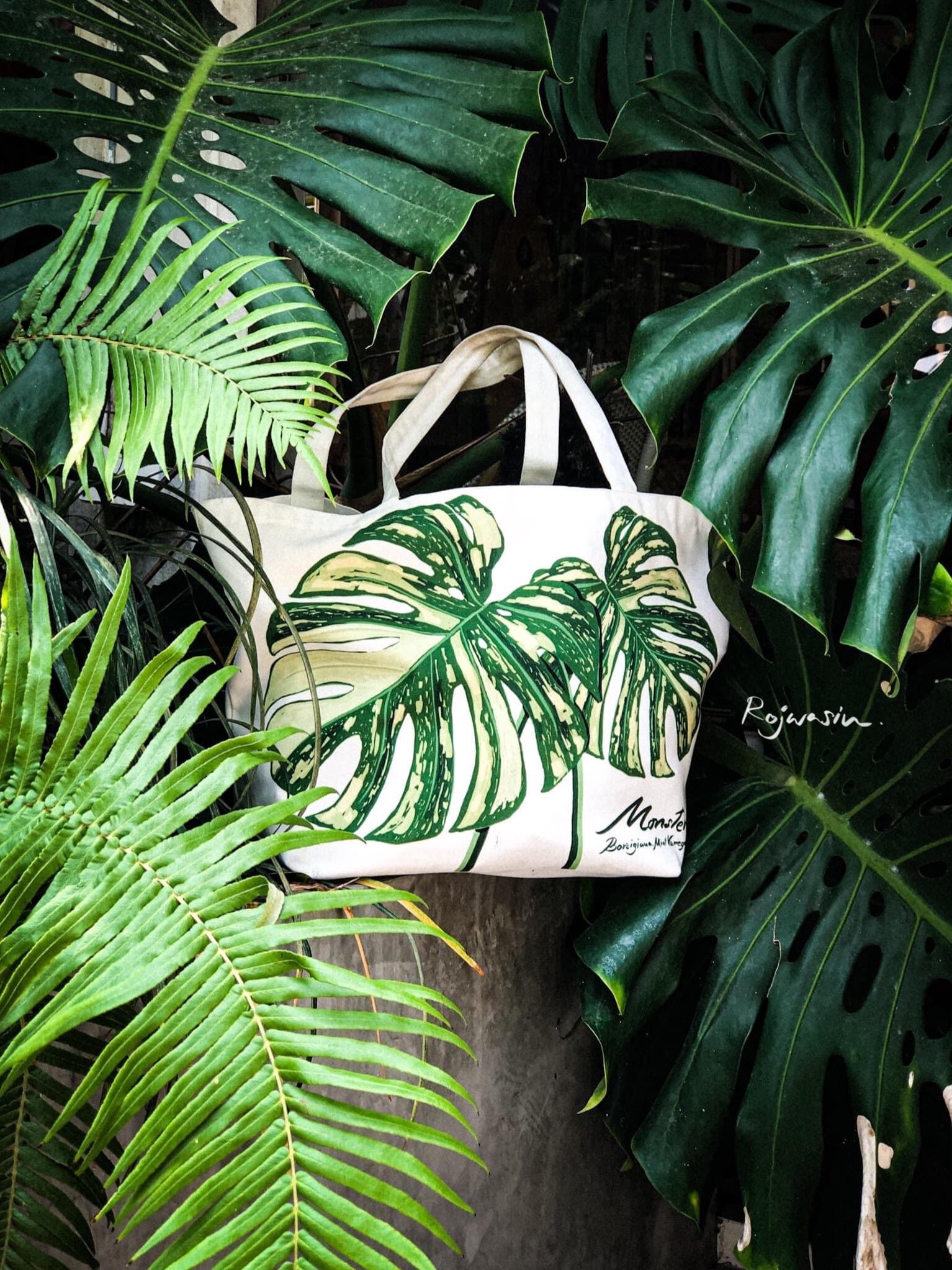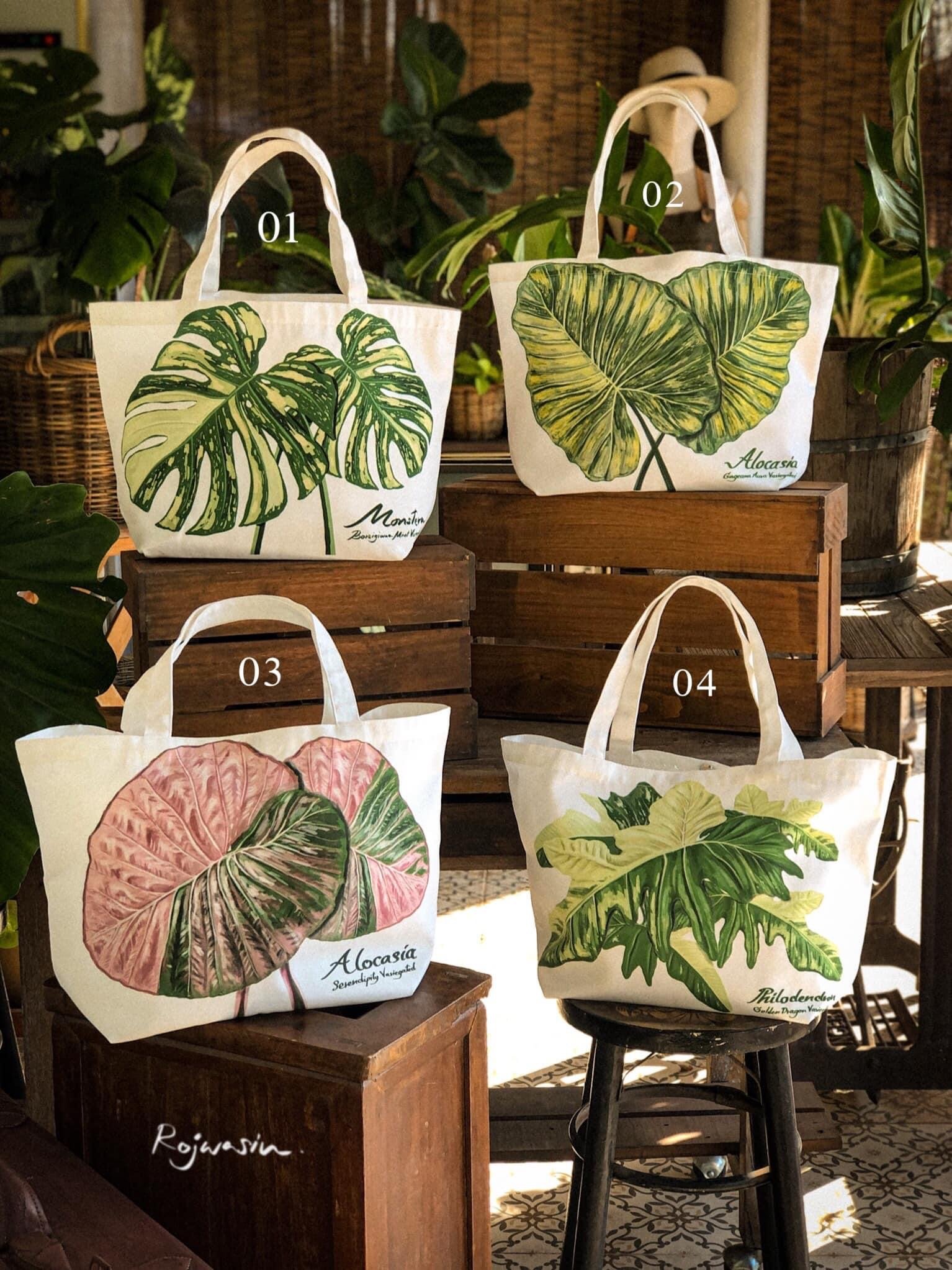 คุณวิว โรฒวศิน นักออกแบบ ผู้สร้างสรรค์ผลงานวาดรูปประกอบ เจ้าของกระเป๋าแคนวาส แบรด์ ROJWASIN โดย คุณวิว ได้แรงบันดาลใจจากการชอบใบไม้รูปทรงต่างๆ เช่น มอนสเตอร์ร่าด่าง (Monstera) และต้นไม้นานาชนิด